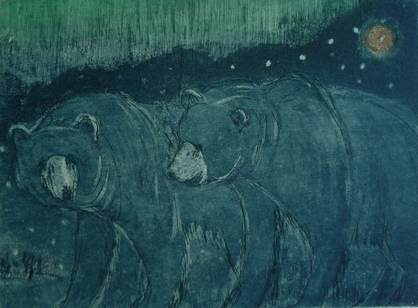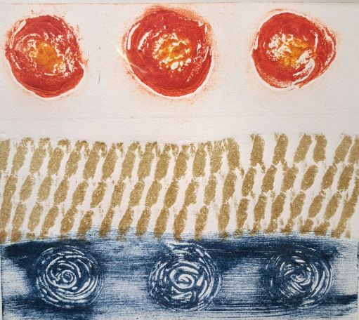 Kolme aurinkoa (tekniikka: carborundum ja collagrafia)